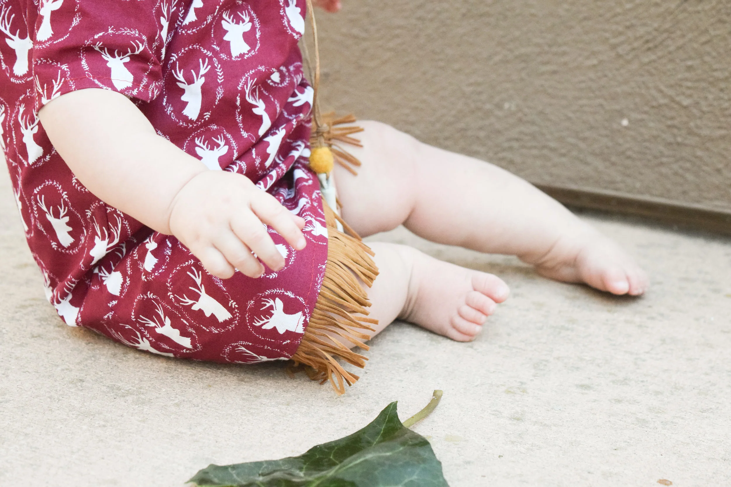 This darling little maroon reindeer dress was the perfect outfit to show off Ava's new kids teepee! With leather fringe on the bottom and some darling brown baby gladiator sandals, this outfit was definitely one of my favorites. And although Ava just wasn't having it, the photos don't do the dress justice because it's an off the shoulder kids dress! Pretty darling, huh? I think so!