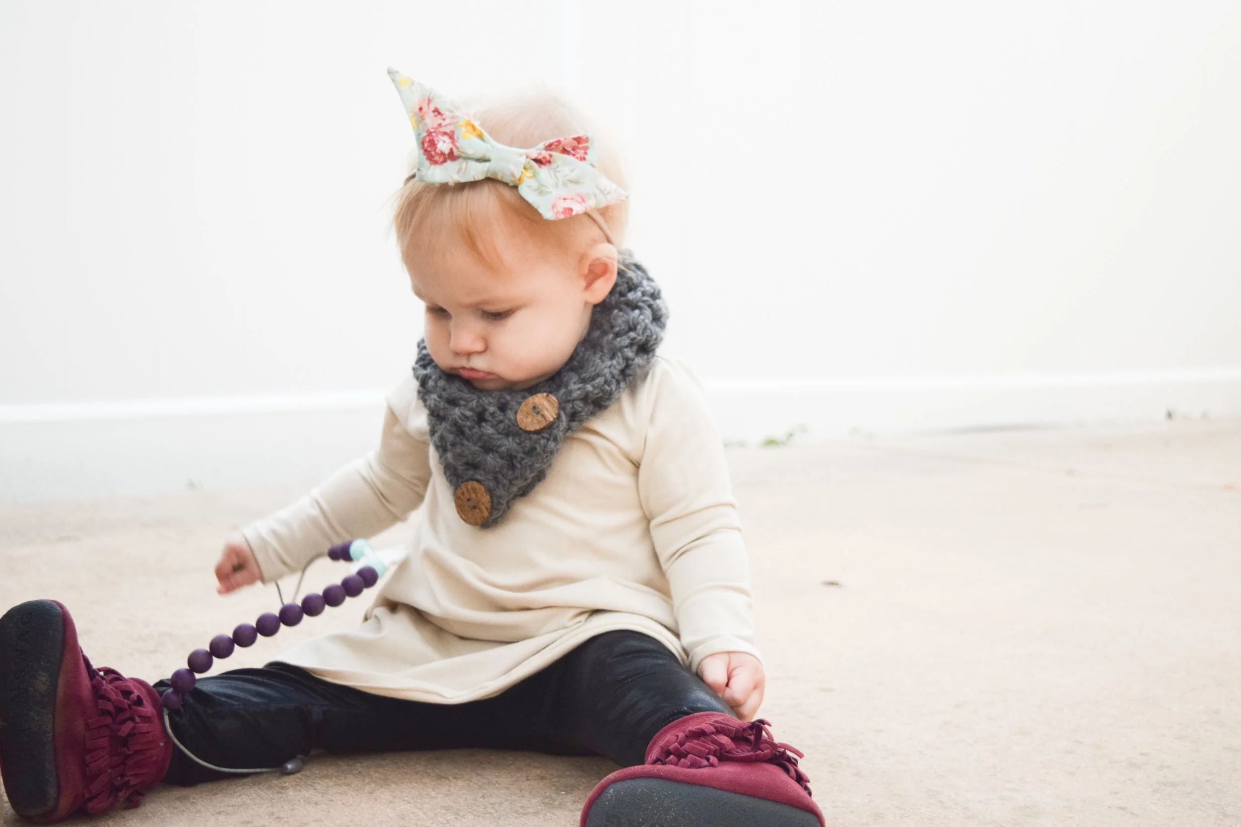 Today's featured fall baby outfit just screams fall fashion! And we switched it up and added some varying baby accessories so you have some options to think about when styling it. From adding some black baby leggings to trading the baby scarf out for a teething bib or teething necklace, this outfit is everything and more!