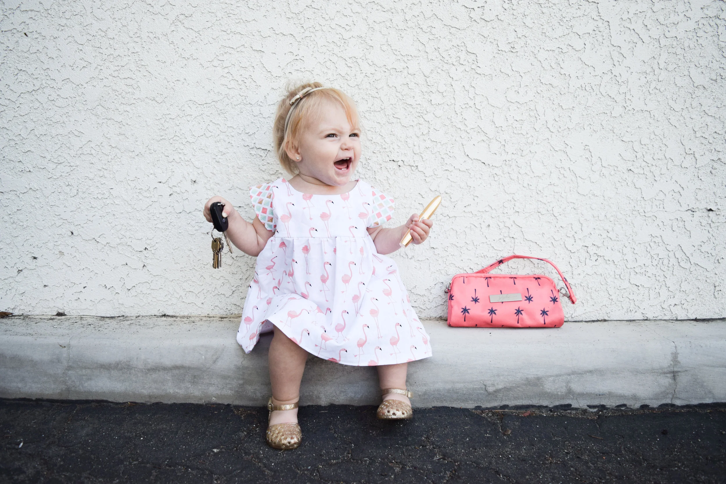 Flamingos and palm trees and cuteness, oh my! Ava's all set for Spring and for Summer in this darling kids Flamingo dress that's just too cute for words. And of course, she doesn't leave the house without her Ju-Ju-Be palm tree purse full of goodies!